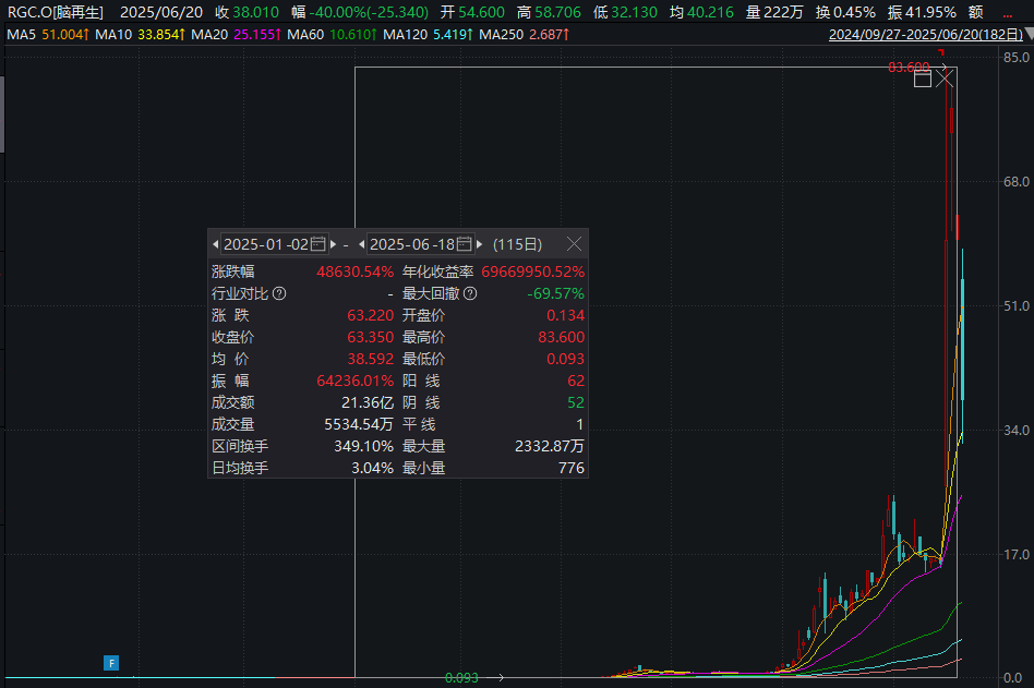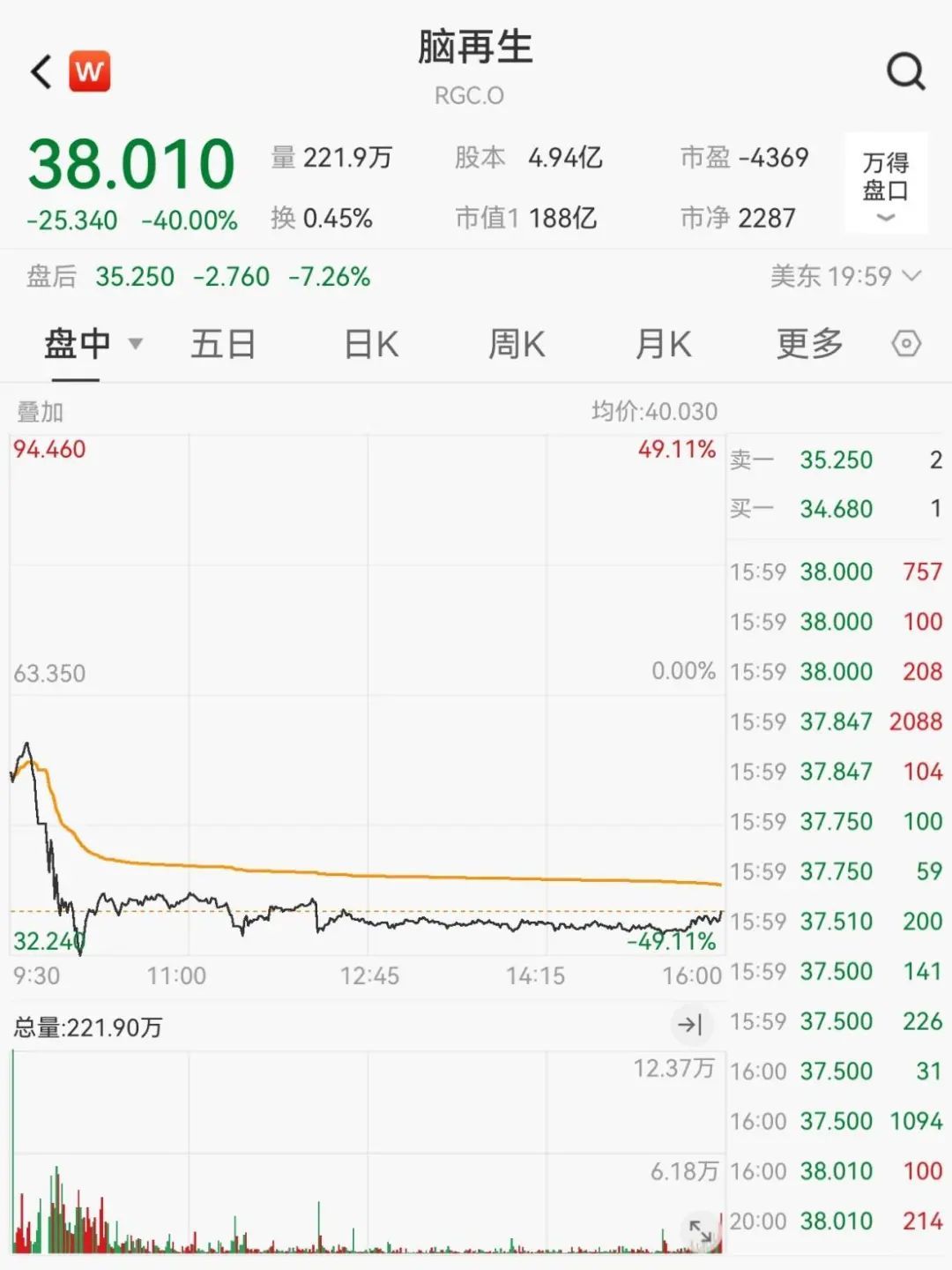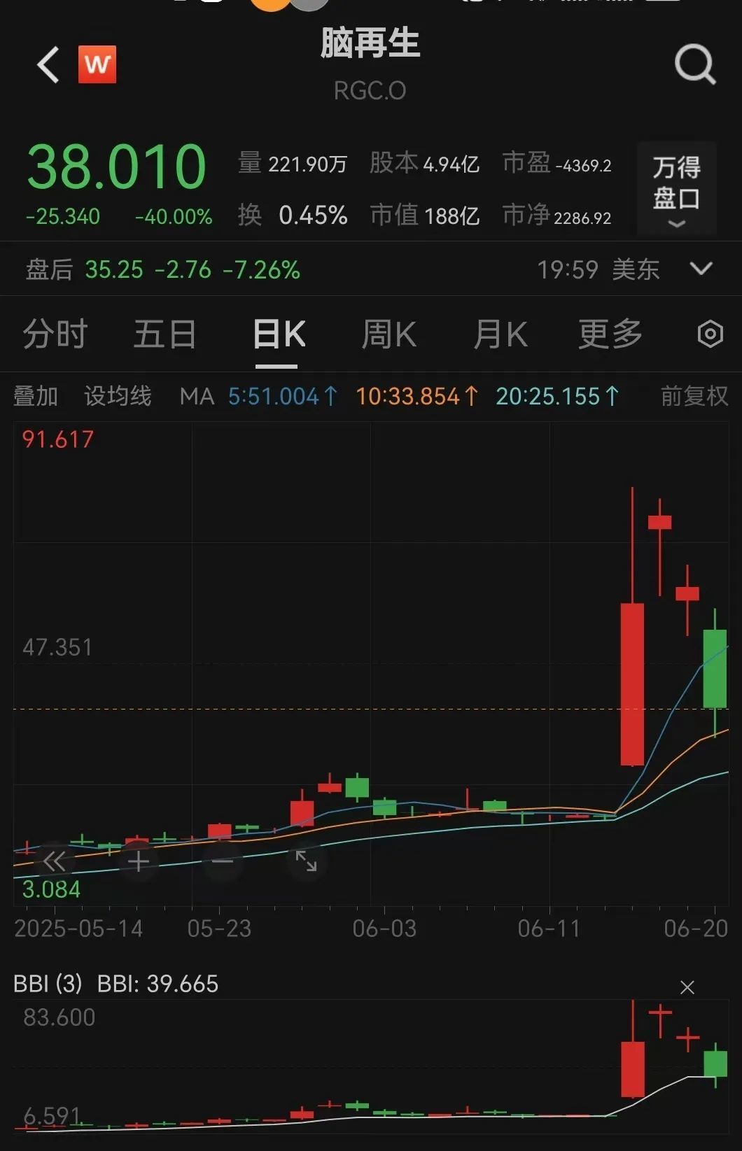 美东时间6月20日,脑再生科技盘中大幅下探。截至收盘,该股跌40%,股价报38.01美元/股,总市值为188亿美元(约合1349.82亿元人民币)。